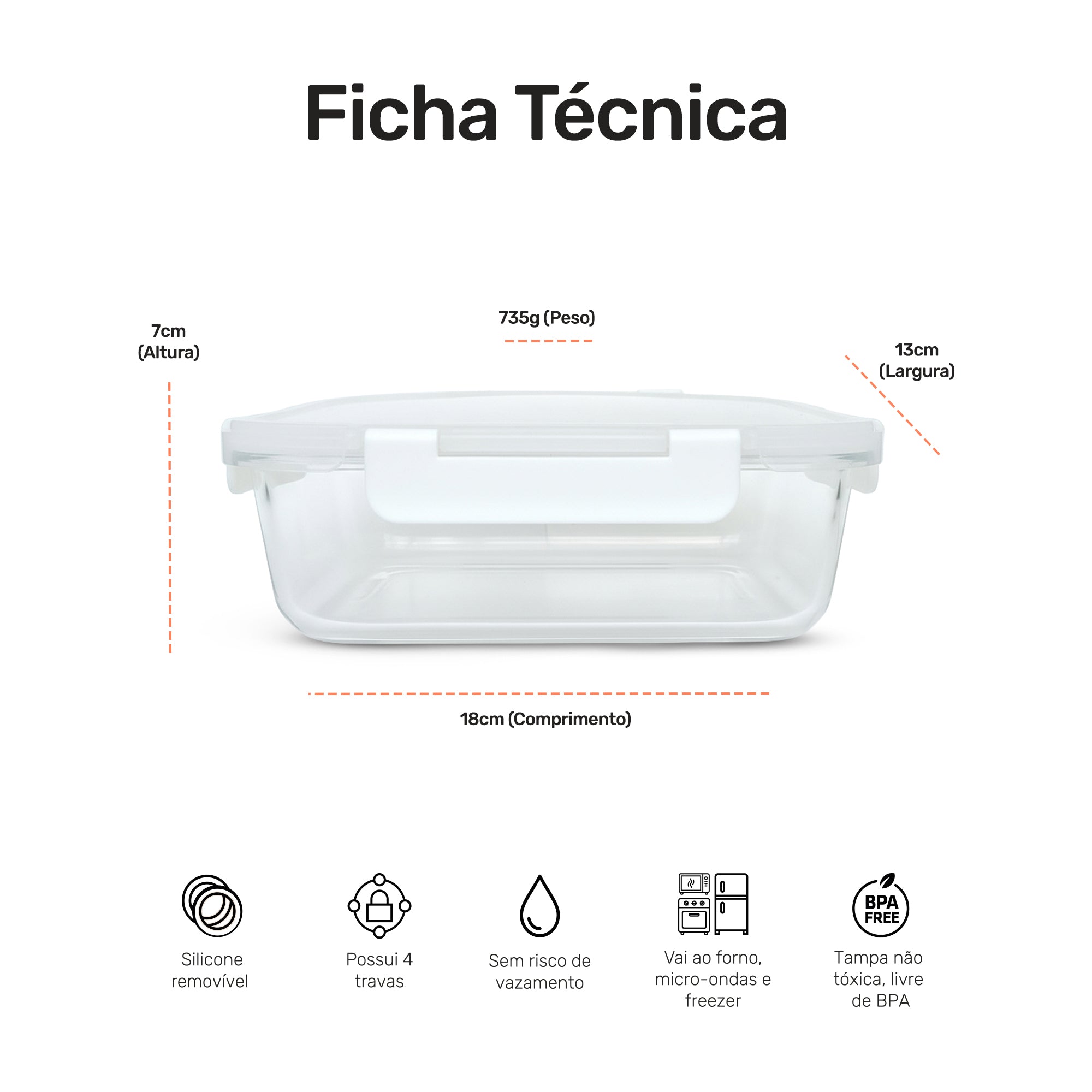 Pote de Vidro Retangular com Tampa Hermética 1520ml