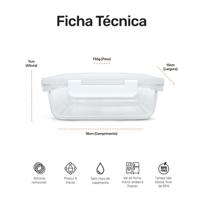 Pote de Vidro Retangular com Divisória e Tampa Hermética 640ml