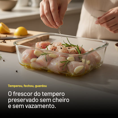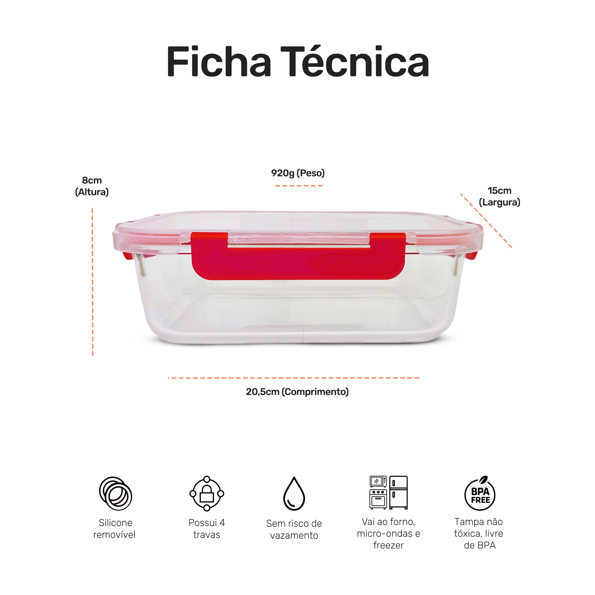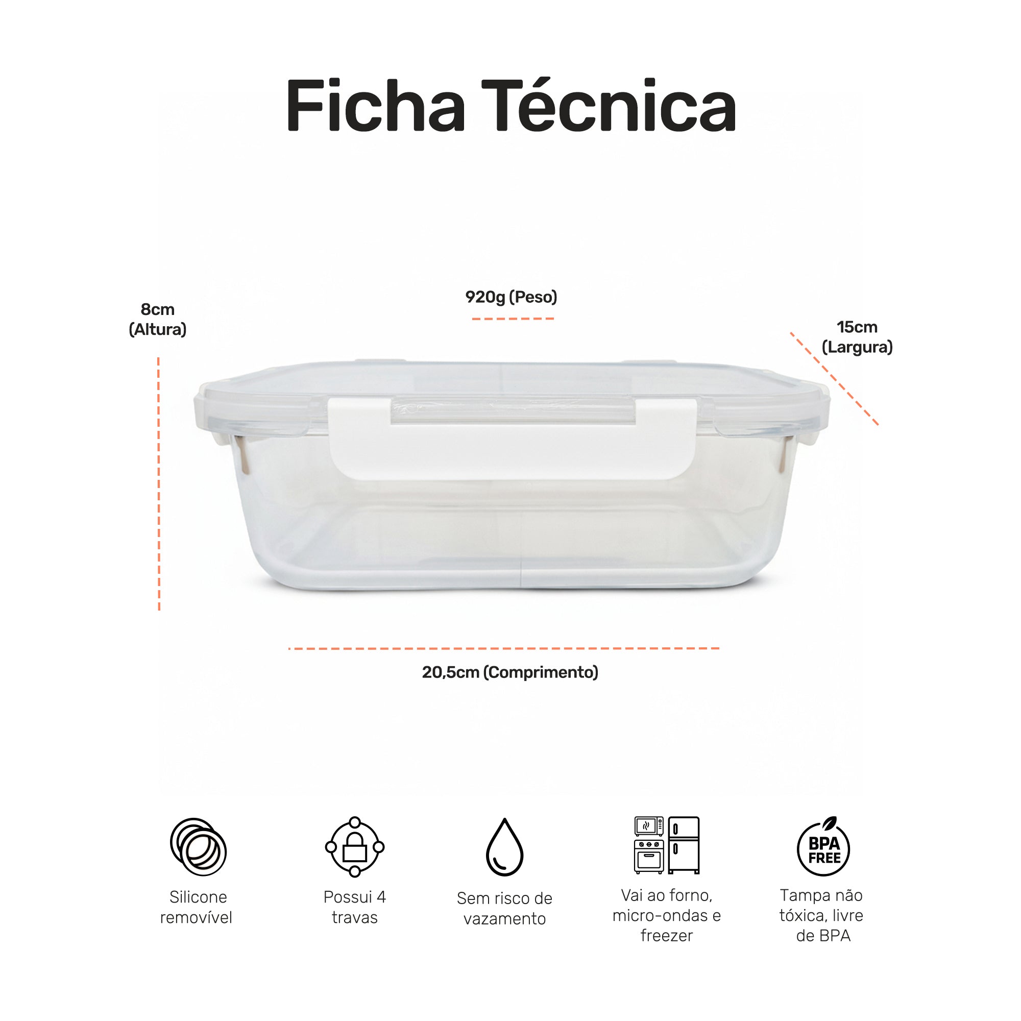 Sugere-se higienizar com sabão neutro e esponja macia, evitando produtos abrasivos no processo de limpeza. O vidro borossilicato suporta variação térmica de até 300°C, podendo ser utilizado no freezer, micro-ondas, forno, air fryer ou lava-louças.